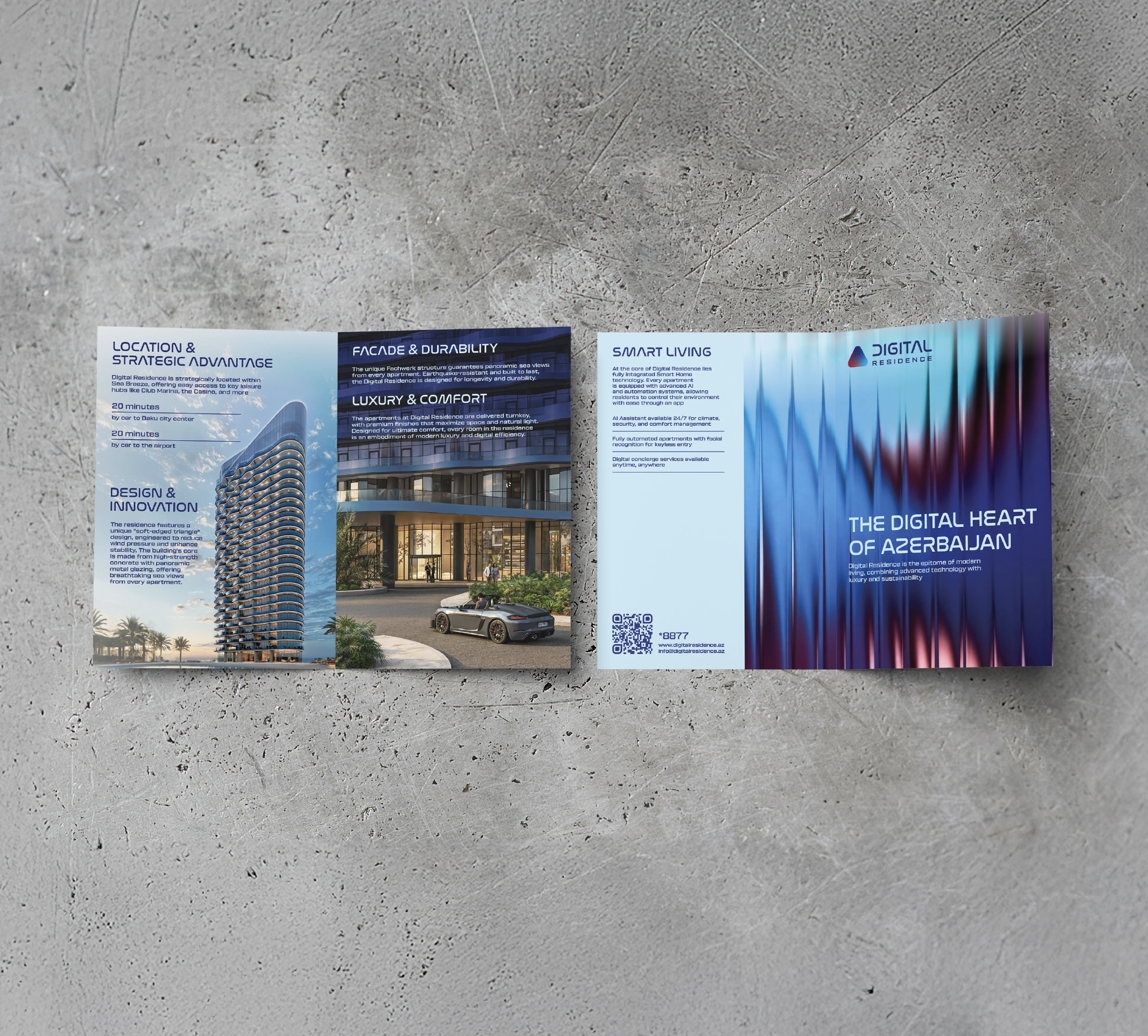 У результаті проєкт отримав цілісний і впізнаваний бренд із виразним діджитальним характером та відчуттям футуристичної глибини. Візуальна мова бренду передає інноваційність, інтелект і спрямованість у майбутнє, залишаючись стриманою та преміальною. Знак бренду побудований на архітектурній логіці та має форму трикутника — символу структури, стабільності й конструктивного підходу. Колірна система логотипу відображає ключові матеріали будівництва комплексу: метал, скло та бетон, підкреслюючи зв’язок айдентики з реальною архітектурою об’єкта та формуючи сучасний, технологічний образ Digital Residence.